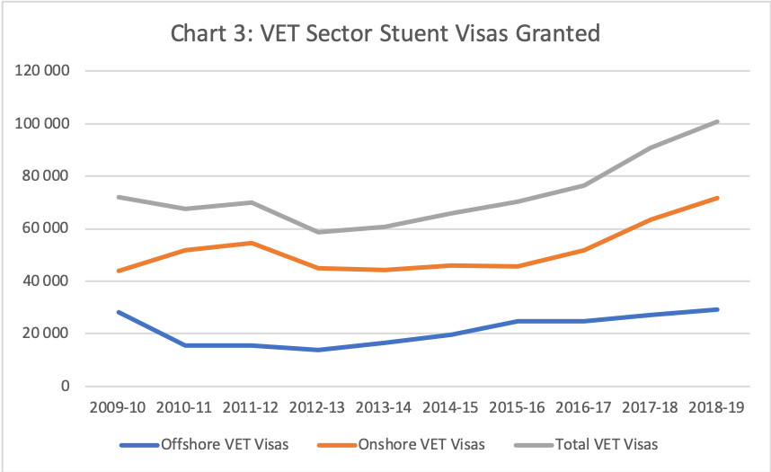 It was associated with a surge in VET student visas granted, particularly to students who initially entered Australia on another visa type (see Chart 3). As at end June 2019, there were almost 150,000 overseas students undertaking a VET course (DHA Student Program Report).