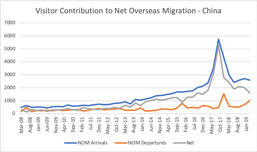 It is thus no coincidence that the rapid increase in asylum applications from Chinese nationals came soon after as reflected in the Chinese visitor contribution to net overseas migration in the chart below. While electronic lodgement and auto-grant are options worth exploring, they must be implemented with care and caution. Pezzullo appears to have rushed implementation, perhaps to save money and/or his general disregard for the work of visa processing staff.