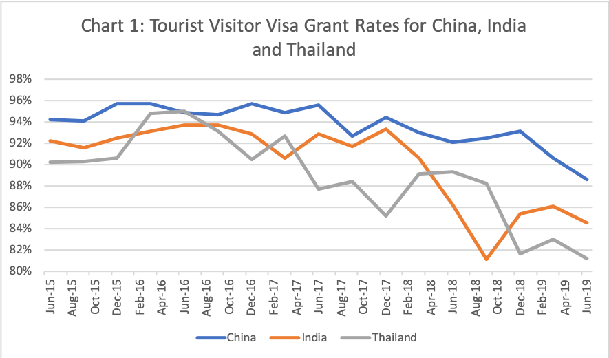 Since early 2017, Dutton has been steadily reducing grant rates for visitor visa applications from Asian countries (see Chart 1). The Department of Home Affairs defines the visitor grant rate as the ‘total number of visitor visas granted divided by the total number of visitor visa applications decided’.