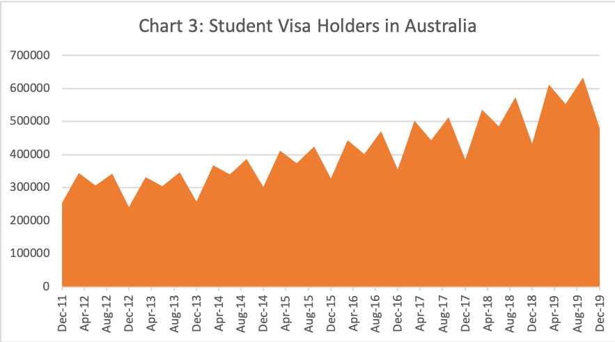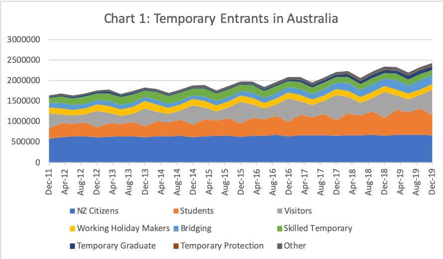 As Chart 1 shows, the number of temporary entrants in Australia has increased from 1.605 million in December 2011 to 2.433 million in December 2019, an overall increase of over 0.8 million.