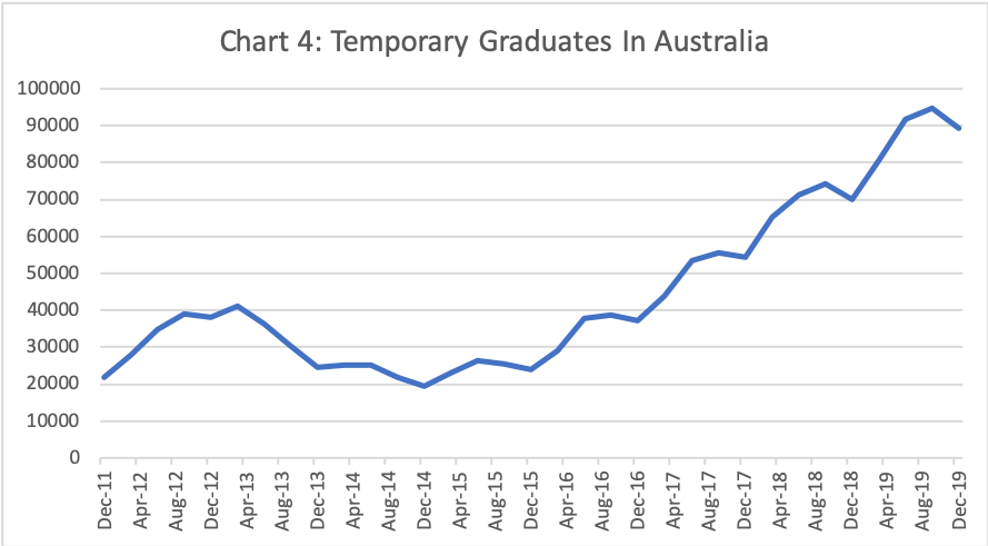 Flowing on from the growth in student numbers has been the strong growth in temporary graduates (ie a 2-4 year visa that is available graduate students depending on the level of study undertaken). These have grown from 21,911 visa holders in December 2011 to 89,324 visa holders in December 2019.