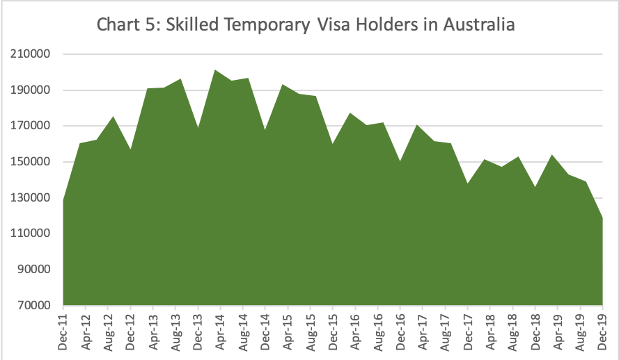 Despite the volume of media coverage, the number of skilled temporary visa holders in Australia has been in steady decline since its peak in late 2013 (see Chart 5). As a result of the changes made by Dutton in 2017-18, the application rate for this visa is now in decline and as a result the flow-through application rate for employer sponsored permanent migration is also declining.