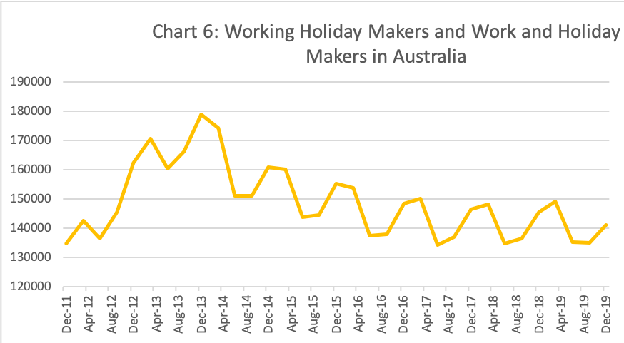 Another major temporary entry category is the working holiday maker (and the generally higher immigration risk work and holiday) visa. The number of people in Australia on this visa has also been in steady decline due to rising competition for these high yield tourists, extensive media reports of these visa holders being abused by employers as well as introduction of a special tax targeting these visa holders.