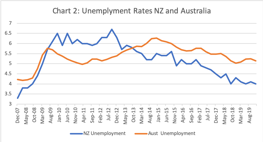 For most of 2019, the New Zealand unemployment rate was around 4 percent while Australia’s was around 5 percent. This suggests the ABS’s preliminary estimates of the New Zealand citizen contribution to net overseas migration in 2019 may be substantially overstated.