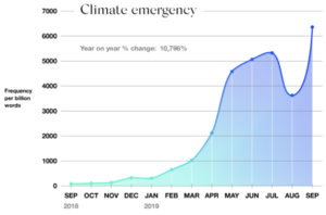 Oxford Word of the Year for 2019 was ‘climate emergency’. Usage increased 100-fold since 2018. It was also a new verbal construction for ‘emergency’ which is usually associated with family situations or crises within jurisdictions (‘states of emergency’): ‘But with climate emergency, we see something new, an extension of emergency to the global level, transcending these more typical uses’. Other climate related terms made the shortlist, for instance climate action (a tripling of use), climate crisis (25-fold increase), eco-anxiety (43-fold increase) and extinction (doubling use).