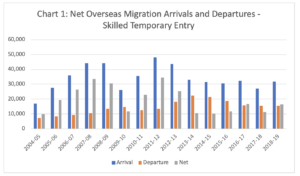 The demand for skilled temporary entry is a reflection of the state of the economy as well as visa design. Chart 1 tracks the contribution of skilled temporary entry to net overseas migration. The number of skilled temporary entrants in Australia peaked in March 2014 at just over 200,000. As a result of Abbott and Hockey’s economy-clobbering 2014 Budget, and unemployment rising to 6 percent in 2014, skilled temporary entry fell sharply with arrivals declining and departures increasing.