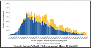 ‘R’ is defined as the mean number of people cross-infected by one case. It is the magic number informing all epidemiological models of the likely progression of the virus under different scenarios and how to keep it below 1, the threshold at which infections grow in the overall population. A good example of the R number falling below 1 before a lockdown was imposed and staying so throughout comes from Germany. This chart from the Robert Koch Institute shows that by 23 March, when the most severe lockdown measures were imposed, R was already below 1 and in the following weeks did not decline any further (Figure 2). That is, the lockdown made no appreciable difference to R.