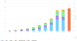 Car sales fell by about a third globally during the first four months of 2020. April was the nadir: sales in the USA halved, Germany dropped 60%, France 90% and UK, Italy and India had almost no sales. Sales are expected to pick up quickly as (if) COVID numbers continue to fall. Electric car sales didn’t escape the collapse except in some European countries where electric sales were up 90% compared with the same period last year. Globally, electric car sales have been increasing rapidly since 2010. In 2019 2.6% of total car sales were electric (half the sales were in China) and about 1% of the total car stock is now electric. (This sounds like the kids asking ‘Are we there yet?’ as you reverse out of the driveway.)