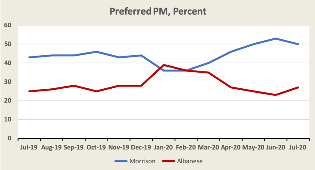 The survey also asks people about how they assess governments’ responses to Covid-19. The governments of Queensland, South Australia and Western Australia all enjoy improved approval, while the governments of Victoria and New South Wales have slipped markedly.
