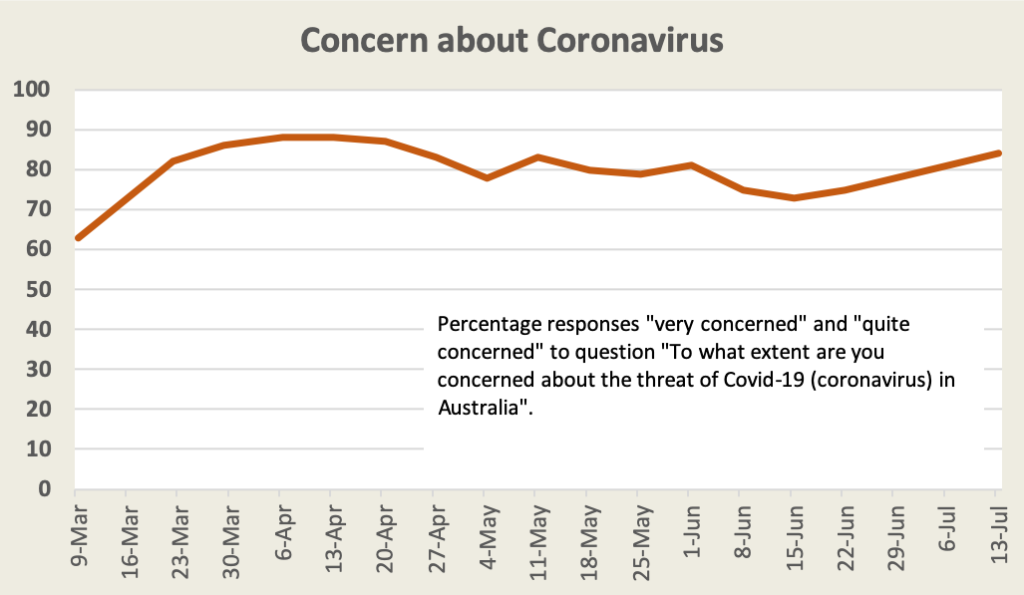 There is also a set of questions on coronavirus. The hitherto slow reduction in concern has reversed. Respondents were surveyed between Thursday 9 July and Sunday 12 July – after Daniel Andrews announced a Melbourne lockdown on Tuesday 7 July, but before Gladys Berejiklian asserted on Tuesday 14 July that her government would not entertain the idea of eliminating the virus.