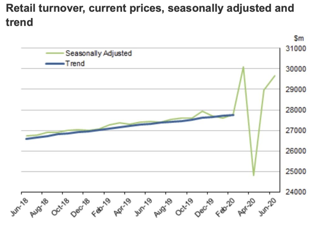 That’s one possible (but probably wrong) interpretation of the ABS preliminary data on retailing up to June. The graph below, copied from the ABS release, suggests a recovery that’s starting to resemble neither a “V” or a “W”, but a Volkswagen trademark.