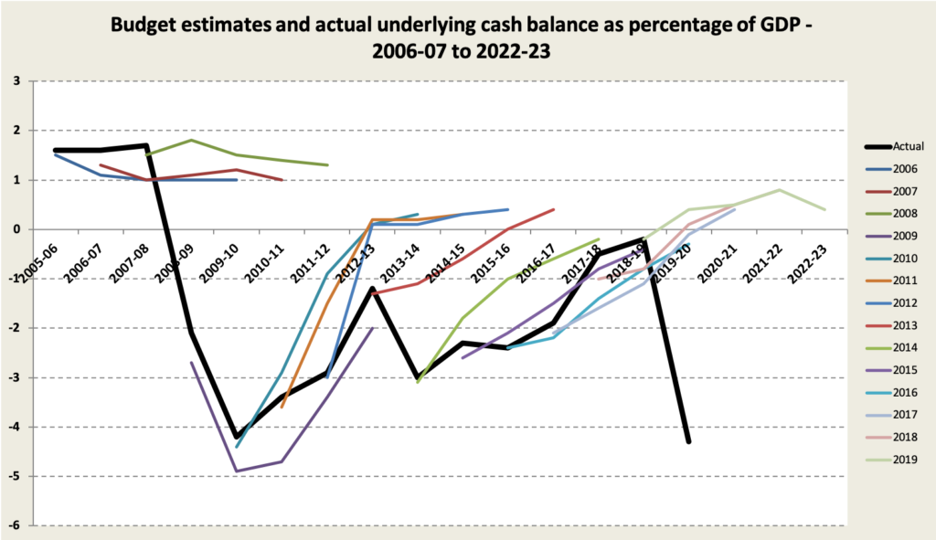It makes a number of economic forecasts (mostly on P31). For 2019-20 GDP is estimated to have fallen by only 0.25 percent. In calendar year 2020 GDP is forecast to fall by 3.75 per cent, before rising by 2.50 per cent in 2021, but so many assumptions underlie these economic forecasts, and therefore the document’s fiscal forecasts, that the document is best seen as a form of occupational therapy for bewildered Treasury economists. The only reasonably reliable estimate is that the budget’s underlying cash deficit for the financial year just past is around 4 per cent of GDP. That’s shown on the graph below: the fiscal outcome is always hard to get right, even when there aren’t severe bushfires and pandemics – so why does the Coalition make such a fuss about it?
