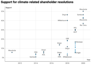 Whitehaven Coal may have got approval to extend the life of their Vickery coal mine in NSW for another 30 years but not all their shareholders are keen on the idea. A hundred shareholders have tabled a motion for Whitehaven’s next AGM that calls on the company to develop a plan to wind up its coal production in line with the goals of the Paris Agreement. The evidence is clear: if we are to keep global warming under 1.5oC, or even 2oC, most of the coal that’s still in the ground has stay there. But there’s a second reason for Whitehaven to exit coal. It’s a dying industry and that makes it a poor financial investment for the company and its shareholders. In July 2018 Whitehaven’s share price was $5.90 but it has fallen steadily since then and is currently under 90 cents. Shareholder activism has grown in Australia over the last ten years and it’s no longer just troublesome climate activists buying a few shares so they can stir the pot at companies’ AGMs. Institutional investors such as superannuation funds with large numbers of shares are increasingly supporting these motions because they want the miners to choose: develop plans to get out of coal or we’ll protect our members’ pensions by selling the shares and buying into other companies with better long term prospects. The chart below shows the increasing number of climate-related shareholder resolutions at Australian fossil fuel AGMs over the last decade and their rapidly increasing shareholder support. (A more analytic view of shareholder activism’s effectiveness was published in The Conversation this week.)