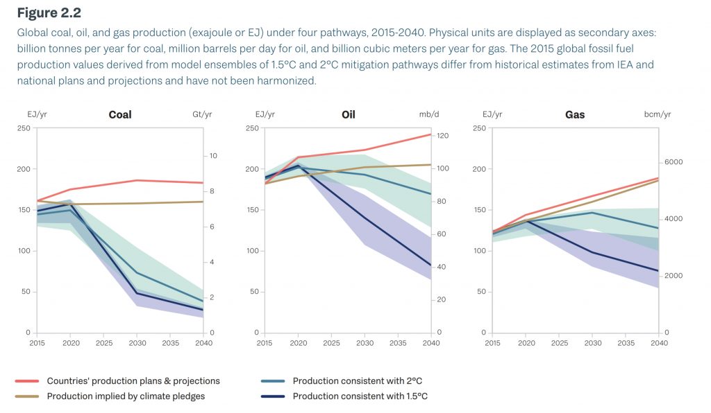 Let’s start with the 2019 UN Environment Program (UNEP) Production Gap report (an update for 2020 is due out soon). This looks as the extraction of gas, and shows that the best climate outcomes happen when we stop digging it up: