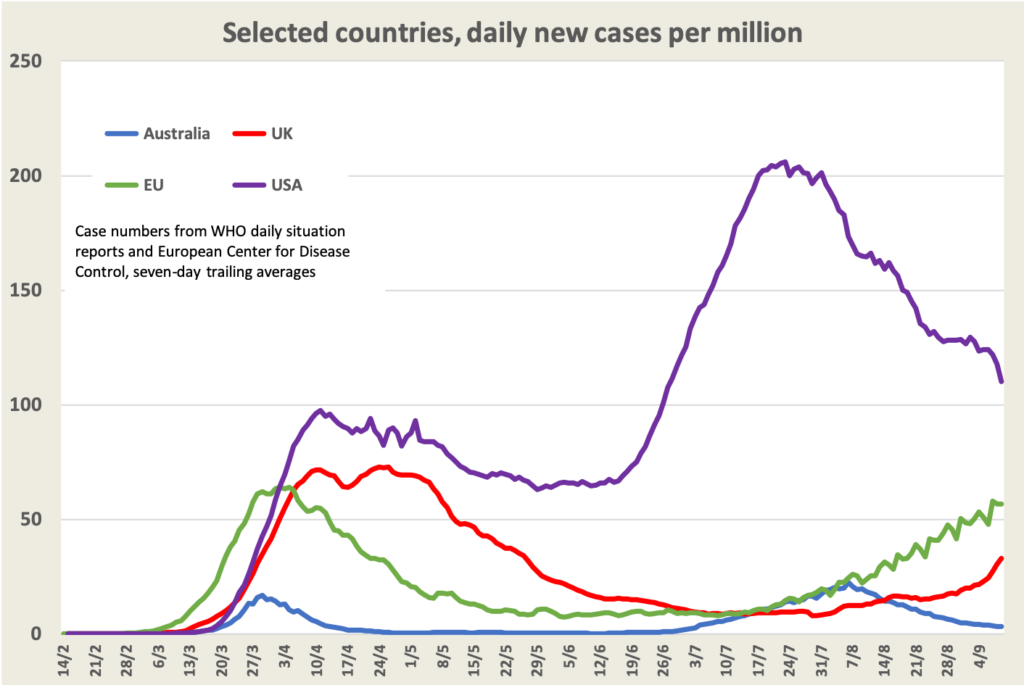 Within Europe it’s a mixed story. France has had a rapidly climbing infection rate – now at about 110 new cases per day per million, which is where the US has fallen to – while neighbouring Germany has a rate of only about 15 new cases per day per million. Spain’s rate is around 200 new cases per day per million, which is the same as America’s peak. The UK has had a recent sharp increase in new cases – unsurprisingly a couple of weeks after their government was urging them to go out and enjoy themselves.