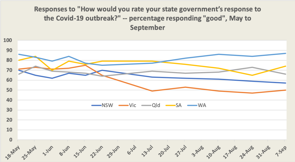 Since late May, Essential has been asking a question: “How would you rate your state government’s response to the Covid-19 outbreak?”. The responses over this period are plotted in the graph below. It is notable, but hardly surprising, that people’s assessment of the Victorian Government fell sharply in July, when case numbers rose and the government tried (unsuccessfully) to lockdown areas by postcode. But there was no significant additional fall in approval in August when the present Stage 4 restrictions started, nor has there been any further fall in approval as it became evident that Stage 4 would probably have to be extended. And Victoria’s approval, at 50 per cent, is not all that far below that of New South Wales, which stands at 57 per cent. South Australia and Western Australia, which seem to have eliminated community transmission, have ratings of 74 per cent and 87 per cent respectively.