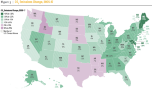 3 Looking at the change in CO2 emissions between 2005 and 2017, four jurisdictions (top marks to Maryland) have reduced their emissions by over 30% while several states have increased their emissions, Idaho taking the wooden spoon with an increase of 17%. States to the east of a line from New Orleans to Chicago are performing best.