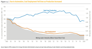 4 Finally, Making Coal Great Again – Trump’s rallying call. Total coal production peaked in the USA around 2007 and has fallen steadily since – to about 65% of the peak by 2018. But look at employment in coal production. Numbers fell about 70% between 1980 and the early 2000s. By 2018 the coal industry employed only about 20% of the people it employed in 1980. Most of the workforce reduction was prompted by automation between 1980 and the early 2000s when production was increasing. It takes about a fifth as many miners to produce a ton of coal now as it did in 1980. So much for mining companies looking after their communities.