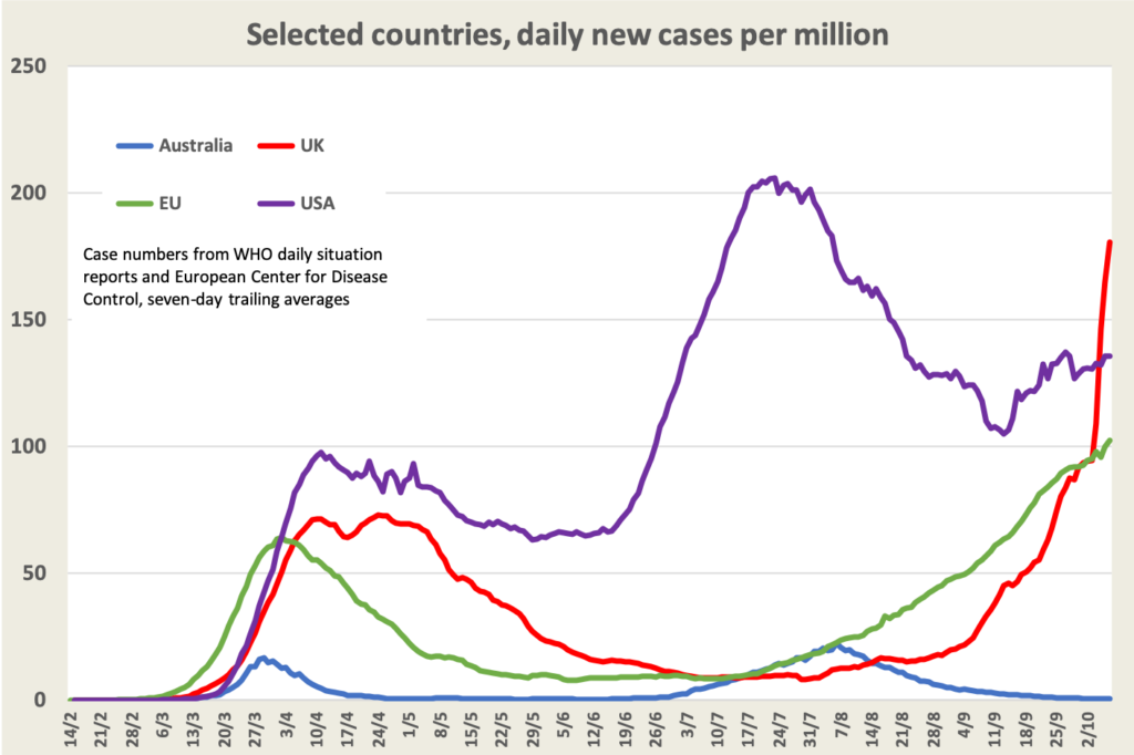 In most of Europe infections are on the rise, exceeding 200 daily new cases per million in the Czech Republic, Netherlands and Spain, and with hotspots in other countries. . Only the Nordic countries seem to have rates around 20 to 40. According to Britain’s BBC, Madrid has averaged a daily infection rate above 500 per million, which would put it way off the chart’s axis.