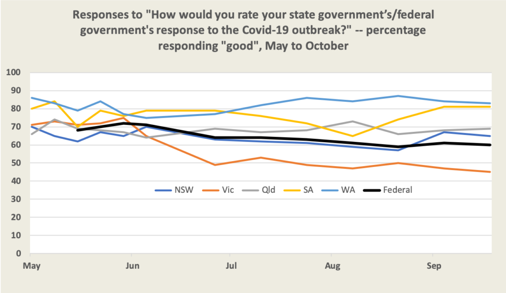 Again, people are polled on how well they think governments are handling the virus. Highest ratings go to Western and South Australia. There is no confirmation of media reports that the Queensland Government is losing support. Victoria’s rating continues to slide, but considering how badly it screwed up hotel quarantine, and the chorus of criticism from hairdressers, bars, gyms, cafes and poodle pedicure shops, its support is holding up reasonably well.