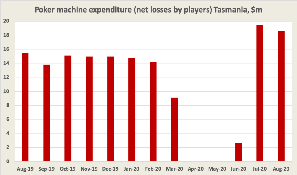 The Victorian Responsible Gambling Foundation reminds us that gambling venues in Victoria have been closed since mid-March. The Foundation is concerned to see what will happen when gaming venues, particularly poker machine venues, re-open. It poimts out that when poker machine venues in Tasmania were re-opened in late June, there was a surge of expenditure on poker machines, shown on the graph below. (Data from Tasmanian Treasury.)