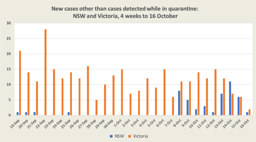 In the last 14 days Victoria has had 138 cases in the community, 83 of which were traceable to a known local source, 55 under investigation. Of the 41 cases in New South Wales (excluding those in hotel quarantine), all but 3 were traceable to a known source. Both states are testing abut 16 000 people a day, which means New South Wales, with a larger population, has a lower per-capita testing rate, but Victoria still has a higher rate of positive cases per 1000 tests.