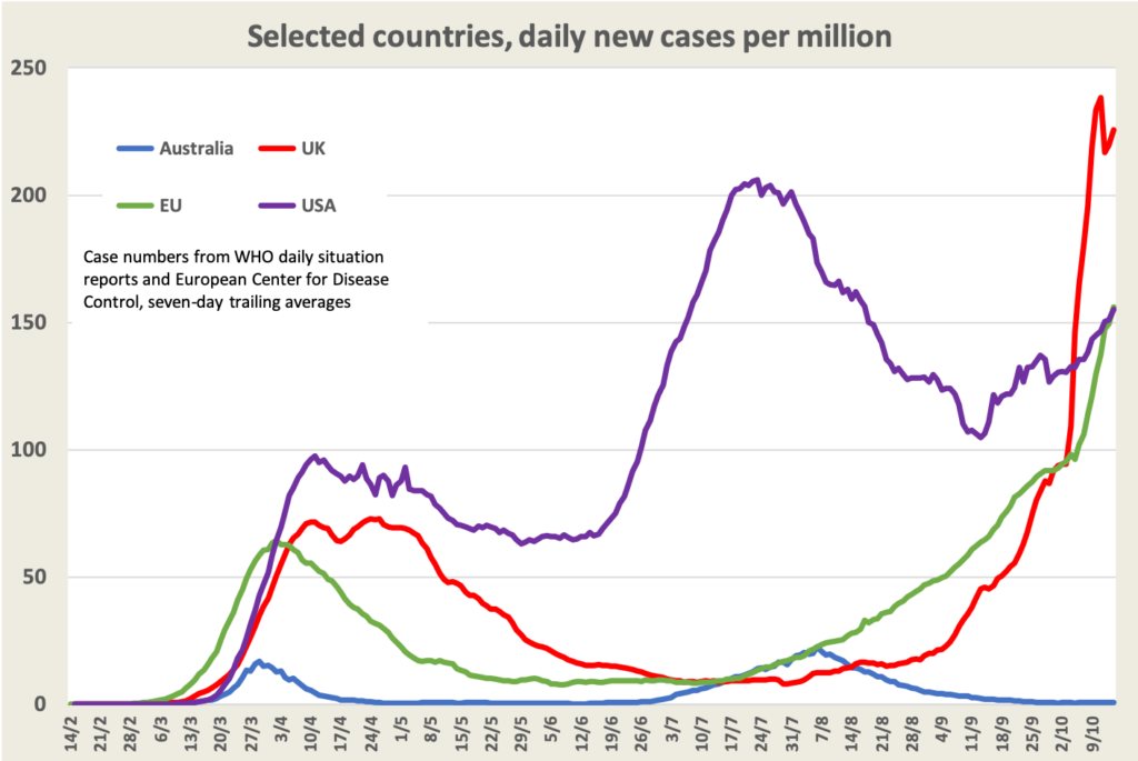 You are probably familiar with media reports of Covid-19 outbreaks in the USA and Europe. They’re true – if anything understated. Europe is going through a second wave that dwarfs the first wave they experienced in their Spring, and the USA is going through a third wave, this time concentrated in the midwestern states.