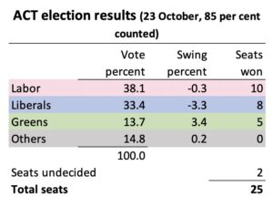 At the time of writing two seats in the ACT’s 25-member assembly are too close to call, but its composition will be a Labor-Green government, either in coalition or in close cooperation, with one, or probably more, Green ministers, following a strengthening of the Green vote at the expense of the Liberal vote. (The ACT is blessed in having no National Party.) The Greens’ representation in the assembly will be 5 or 6 seats, up from 2 in the outgoing assembly.