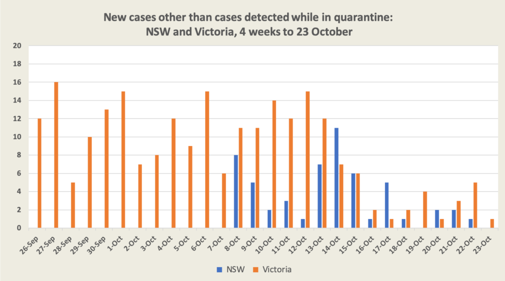 In terms of case numbers, Victoria and New South Wales now seem to be on similar tracks, as a glance at the most recent week’s data on our regular chart suggests, but New South Wales has far fewer mystery cases than Victoria. There is a big difference between dealing with the messy tail end of a big outbreak and a situation where the virus is close to local elimination but with the occasional outbreak.