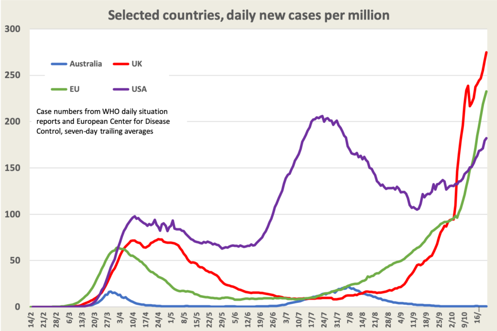 To understand what a rate of 300 daily cases per million means, which is where the UK is heading, we could imagine Victoria dealing with 2000 cases every day, with the numbers on the rise. (Victoria’s one-day peak was 723.)