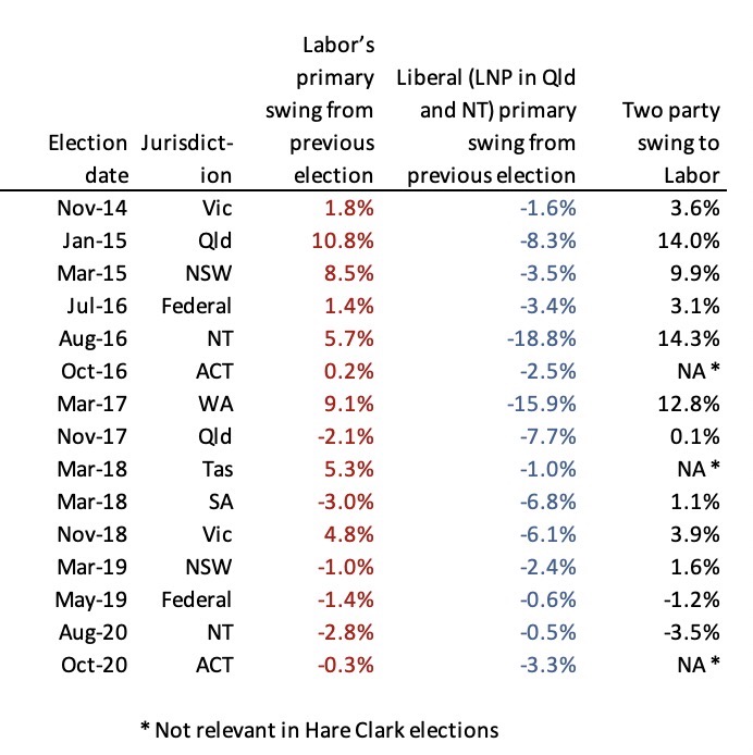 This is now the 15th Australian election since 2014 in which the Liberals have lost ground in their primary vote. The party swings are shown in the table below – see the blue column.