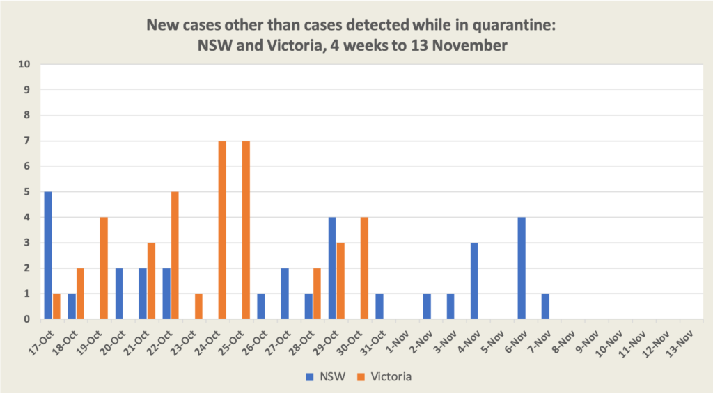 Over the last two weeks 108 new cases of Covid-19 have been recorded in Australia. Of these all but 12 (11 in New South Wales and 1 in South Australia) have been travellers in hotel quarantine. Quoting epidemiologists (Hassan Vally, Catherine Bennett), the ABC journalist Catherine Hanrahan suggests that coronavirus could disappear if New South Wales and Victoria maintain control.
