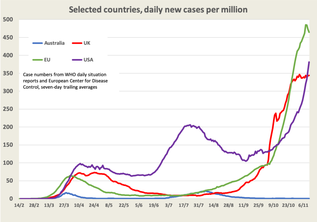 We should also mention Sweden, still the model for right-wing libertarians who believe the virus should be allowed to spread relatively uncontrolled in the hope of achieving herd immunity. It was holding a reasonably low new case rate until recently – about 50 new cases a day per million people – but in its latest wave the rate has shot up steeply to around 400. Even if catching the virus confers immunity (unlikely), at the present rate of infection it would take about 20 years for the country to achieve herd immunity.