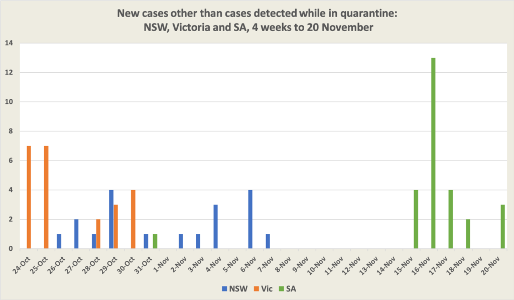 For a non-partisan assessment of the situation in South Australia, Norman Swan has three articles (covering three consecutive days) on the ABC’s Coronacast. We know that the virus came into Australia from one of Europe’s offshore islands, and that it seems to have spread very quickly once a cleaner at a quarantine hotel picked it up from a surface. Writing in The Conversation, Catherine Bennett of Deakin University explains the rationale behind South Australia’s strong lockdown and calls for safer arrangements around hotel quarantine: South Australia’s 6-day lockdown shows we need to take hotel quarantine more seriously.
