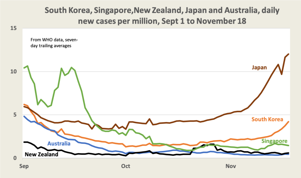 A travel bubble with Japan has been talked about for some time, but while its rate of infections is low by European or American standards, it is showing alarming signs of growth. On the other hand Singapore, which had a significant outbreak among its foreign workers, now seems to be heading down to Australian and New Zealand rates. South Korea has reacted to its rising rates (from a low base) with a set of restrictions, and because it acts quickly it may get back down to very low rates.