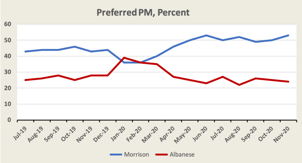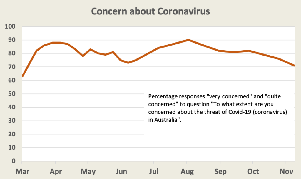 Essential asked their usual question about our concern about the threat of Covid-19. Concern is falling from its August high (when the second wave hit Victoria), but it’s still high.