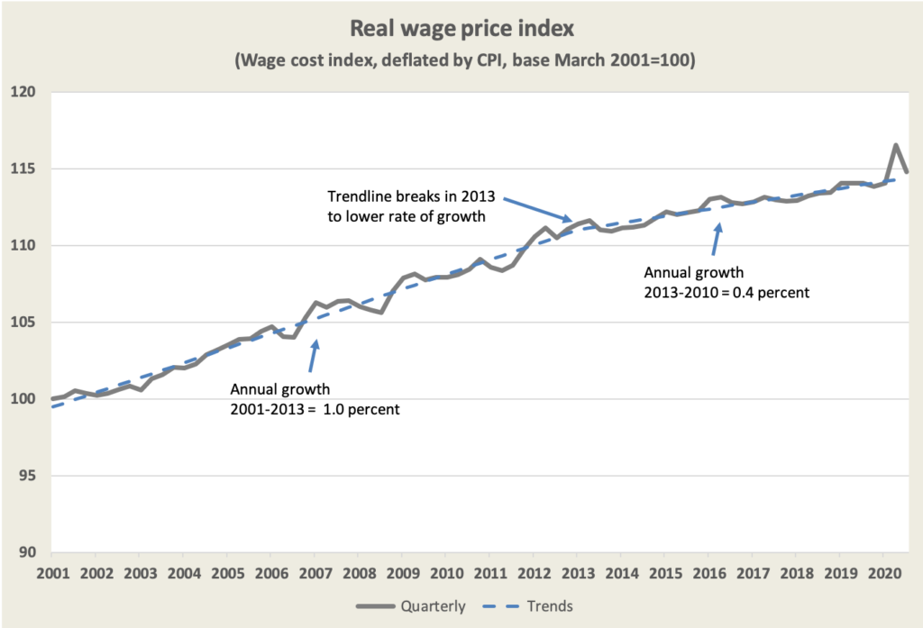 From 2001 to 2013 real wages were rising at 1.0 per cent a year, but from 2013 to 2020 that growth had slowed to 0.4 per cent a year. On an $80 000 income that would be $6 a week.