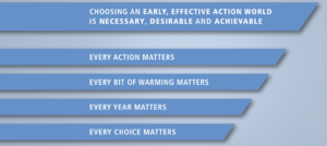 Maybe it’s something to do with my age but I’m not a great fan of, admittedly very clever, infographics that read like a Japanese hanging calligraphy scroll. Others, however, might find this one helpful. It was prepared by the IPCC to demonstrate the possible consequences of three different approaches to climate action: late, uncoordinated action; delayed, decisive action; and early, effective action. The final ‘frame’ concludes: