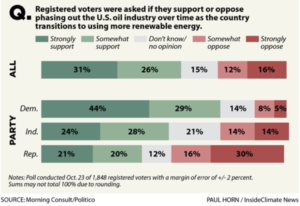 Finally, Americans have a clear choice about climate change on Tuesday. The map below demonstrates that in all states a substantial majority of the population (ranging from 60-94%) considers global warming will be a serious problem in the USA. The bar chart indicates that 57% of voters nationally support the phasing out of the US oil industry. Even among Republican voters 41% support the phase out, with 46% opposed. But will these opinions be reflected in voting patterns?