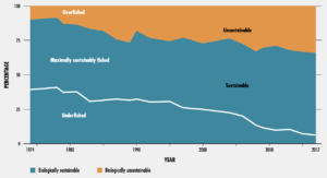 In 2017, 34% of fish stocks were being fished at biologically unsustainable levels and a further 60% were being fished at maximally unsustainably (see figure below, page 48 of link above).