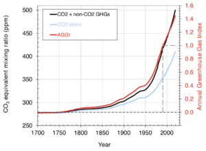 The figure below requires a little study … but it’s worth it. The blue line shows the concentration of CO2 in the atmosphere between 1700 (when the concentration was approximately 270 parts per million) and 2019 (approximately 410ppm), an increase of 48%. The black line is the concentration of all greenhouse gases expressed as CO2 equivalents (like totalling US$100 + AUS$100 + £100 as if they were all US dollars). Here the concentration increased from about 270ppm in 1700 to about 500ppm in 2019, an increase of 85%. The red line shows the Annual Greenhouse Gas Index (AGGI), a measure of the actual global warming influence of greenhouse gases released between 1700 and 2019. The index was set at zero in 1750 and at 1 in 1990. It’s obvious that most of the greenhouse gases released into the atmosphere have been released since 1950 and that the index of warming has increased by almost 50% in the just the last 30 years; CO2 has been responsible for 80% of this increase. The hyperlink to the figure provides more information about the AGGI and also a detailed graph of the changes of each of the greenhouse gases between 1979 and 2019. The bottom line is that the situation continues to get worse; the rate of worsening is accelerating; and COVID really hasn’t changed anything at all.