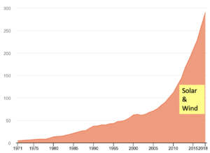 The falling cost and growing attractiveness of renewable energy is well demonstrated by the graph below which demonstrates the four-fold increase in production of solar and wind energy in Millions of Tonnes of Oil Equivalent (Mtoe) between 2005 and 2018.