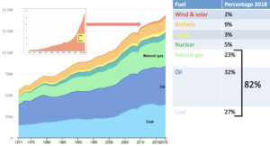 But I wouldn’t want you to get carried away by this escalating increase in the roll out of renewable energy. The source for the graph above is the graph below which is interactive on the website and allows you to display any combination of the fuel sources. As you can see from the data I have added to the right (from the same source), in 2018 wind and solar still provided only 2% of total global energy, while coal, oil and gas provided 82%. There’s a long way to go before the world is 100% renewable.