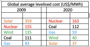While it’s useful to compare the current operating costs of generating one unit of electricity (a megawatt-hour - MWh) by existing coal, oil, gas, nuclear, wind, solar and hydro plants, it’s more useful to compare the ‘levelised cost of energy’. The levelised cost includes not only today’s operational costs but also the cost of building, servicing and decommissioning the plant throughout its entire expected life. The average global levelised costs of utility-scale solar, wind, coal and gas in US dollars in 2009 and 2020 are shown below.