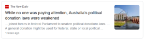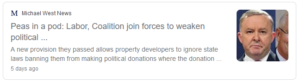 Meanwhile, Labor and the Coalition have just joined forces to weaken political donation laws. The new legislation means that federal laws override existing state anti-corruption laws. Property developers can ignore state laws banning political donations where the donation was “for federal purposes”.