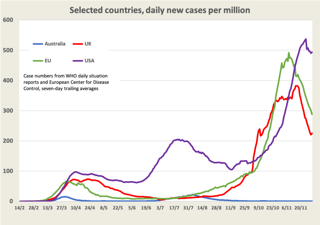 In most European countries cases have peaked. The Economist attributes Europe’s improving situation to lockdowns: Why Europe’s second, less severe lockdowns are working. The viral spread rate – the crucial number R that must be kept below 1 – has responded to restrictions on movement imposed by these lockdowns. The authors base their confidence in lockdowns on data revealed in the regularly-updated article Tracking the coronavirus across Europe. This article, covering 16 countries, shows clearly the benefits of lockdowns in suppressing cases and reducing deaths.