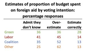 Partisan differences were striking. Coalition and “other” voters were less likely to admit that they didn’t know and more likely to over-estimate the amount spent, as shown in the table alongside. Assuming that the “other” category is dominated by hard right voters (Palmer and One Nation), it confirms that those further on the right are more confident in their knowledge of this issue and are more likely to be wrong. (“Most ignorant of what he’s most assur’d” – Measure for Measure.)
