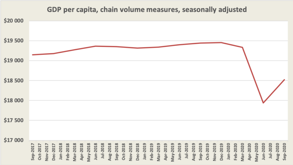 That’s the shonky mathematics of those who refer only to changing percentages, for example claiming that because Australia has now had three months of economic growth, Australia is no longer in recession. If we accept a definition of a “recession” as two quarters of negative growth (”decline” is the usual word in English), then, as shown by the ABS, we are out of recession because we had negative GDP growth in the March quarter (-0.3 per cent) and in the June quarter (-7.0 per cent), followed by growth (3.3 per cent) in the September quarter. But to illustrate the meaninglessness of the “two quarter” definition, think of the figures if the virus had arrived a couple of weeks later, and we had just gotten through the March quarter with a positive figure, had a worse contraction in the June quarter, and had scraped through the September quarter with another positive figure: we could have claimed that we had gone 30 years without a recession, or, with a few minor re-allocations of the timing of economic events, that we had gone since 1788 without a recession. To its credit the ABS does not talk about “recessions” – they leave it to journalists and politicians to abuse the data.