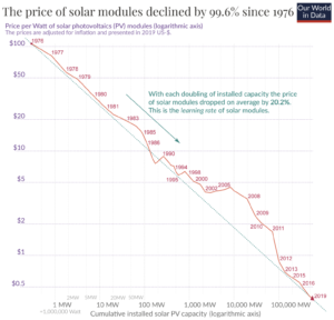 Not only is solar the cleanest and safest source of electricity, it’s also the cheapest (graph below from the same hyperlink). Between 1976 and 2019 the price of solar modules fell from US$100 per watt to US$0.25 per watt (both at 2019 $) – an almost Bradmanesque 99.6% decrease.