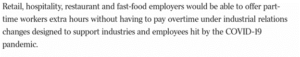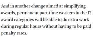 Translation: employers will legally be allowed to ask permanent part-time workers to do overtime without paying penalty rates. Where is the benefit for workers? It seems flexibility for bosses is the only game in town.